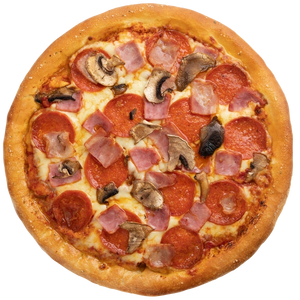 Tomatsås, mozzarella, pepperonikorv (fläsk), skinka, champinjoner och bacon.